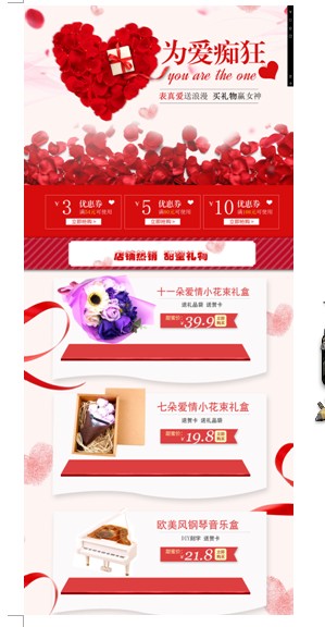图2则是紧扣七夕主题,一打开页面就看到很大的“为爱痴狂”的海报。可以说当我们一点进店铺的时候,第一时间就感受到了节日的气氛。玫瑰花,桃心等元素都是第一时间让人联想起情人节的浪漫元素。还有红色和粉色的色彩搭配,烘托出了节日的氛围。产品也是根据节日的特点,给消费者选择了花朵,音乐盒等产品作为主推款。