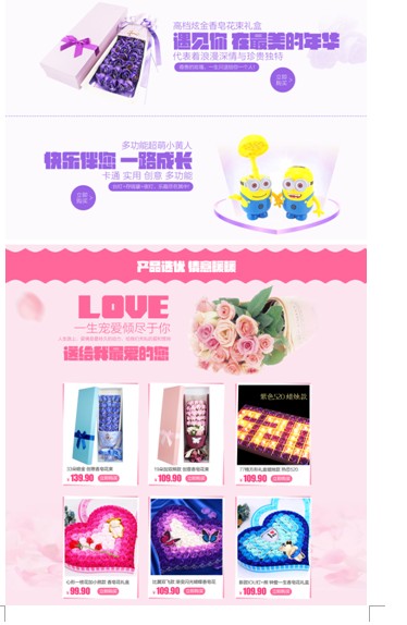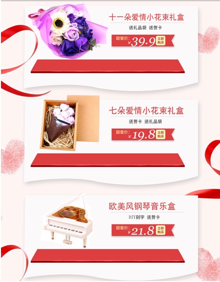如图10将活动分为了送男友专区、送女友专区和装饰摆件专区,很清晰的例举出了不同的专区,方便客户对想要的产品进行选择购买。可以说很贴心的考虑到了客户的购买心理。